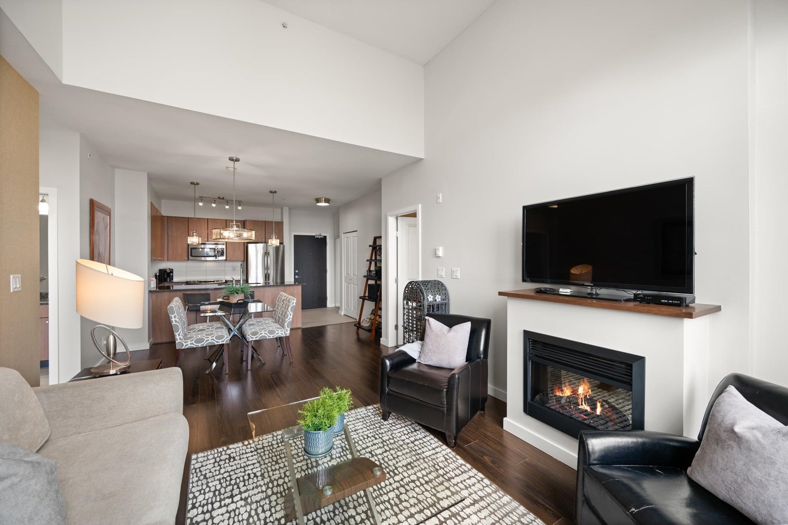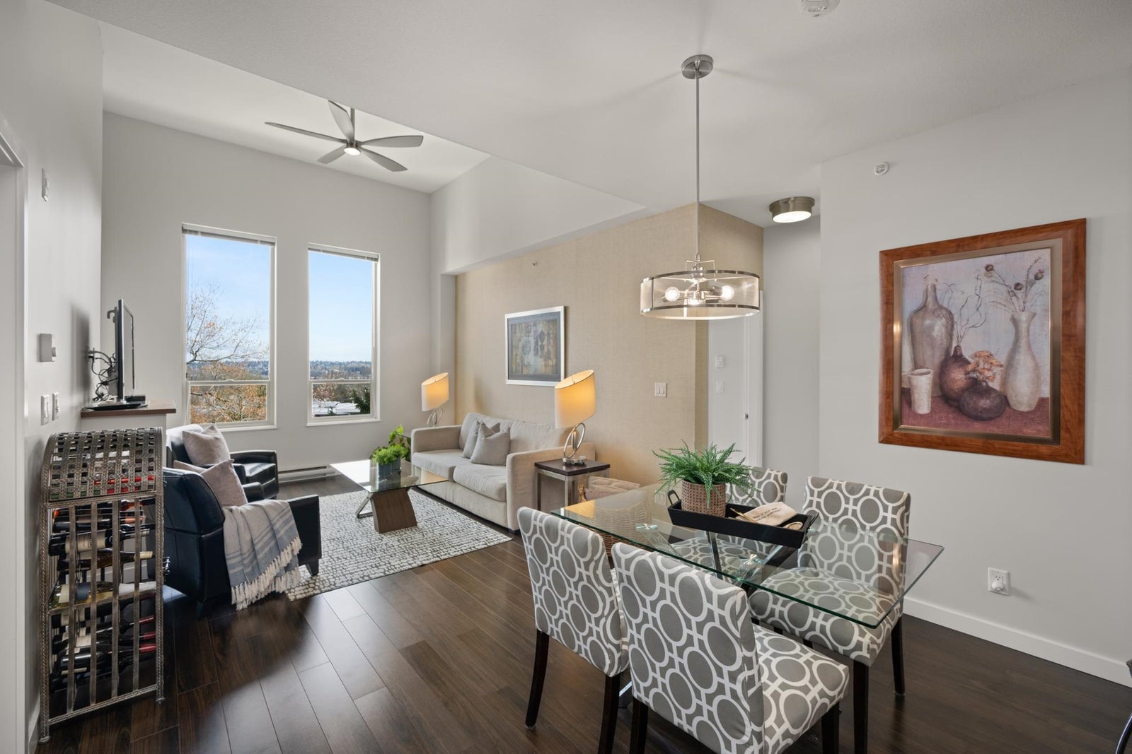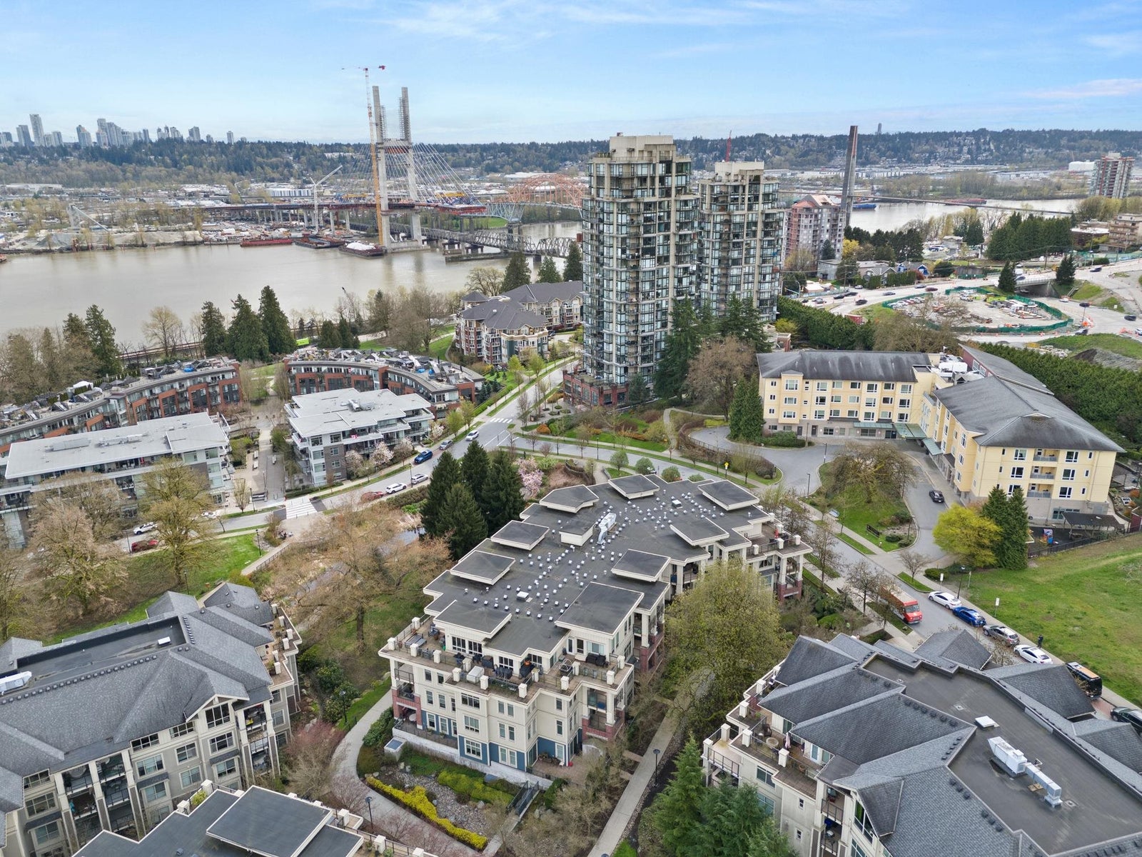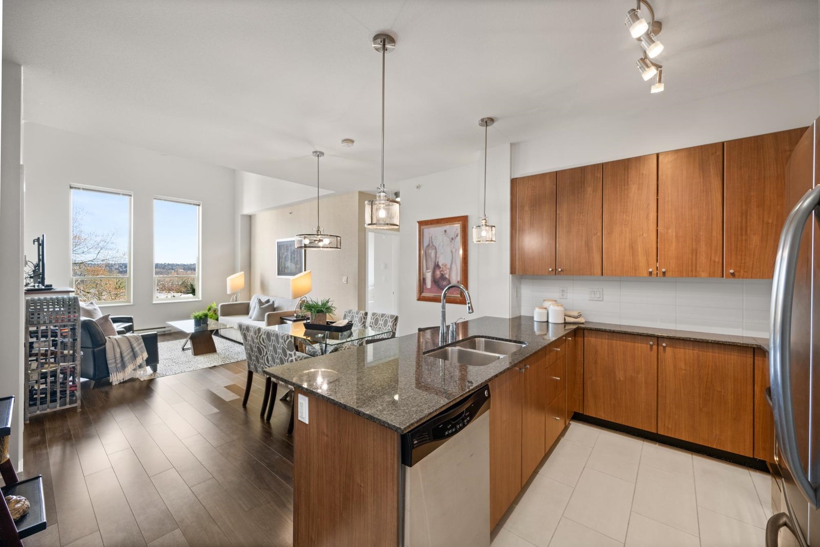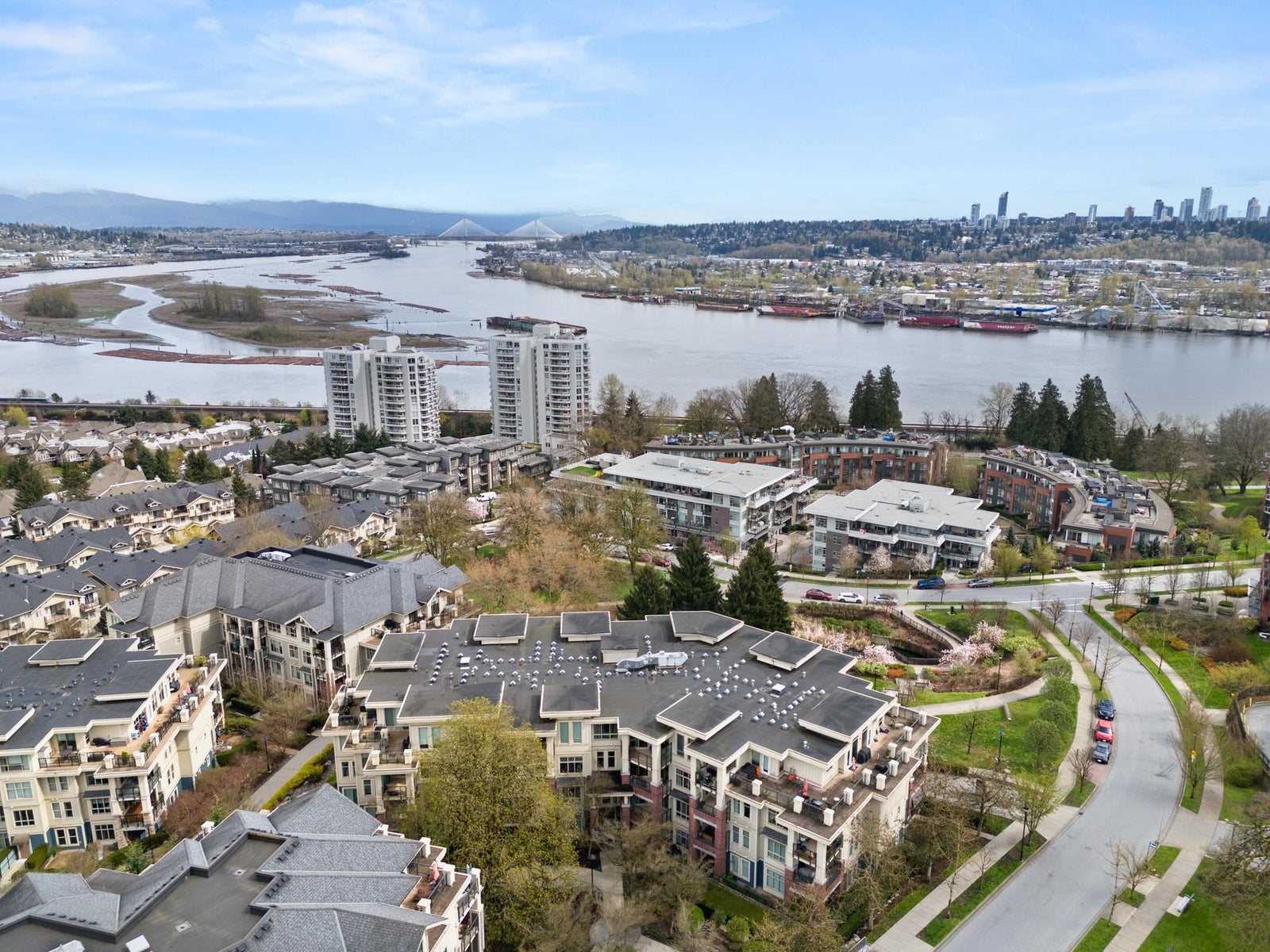 Welcome to this stunning TOP-FLOOR PENTHOUSE at The Grove in Victoria Hill! This bright & airy home boasts an open-concept layout, perfect for entertaining, w/ soaring vaulted ceilings & expansive windows that flood the space with natural light. The chef-inspired kitchen features wood cabinetry, a sit-up breakfast bar, granite counters, designer paint, sleek laminate flooring, this home is truly move-in ready. Thoughtfully designed layout places the bedrooms on opposite sides, creating a perfect sense of privacy. Lovely large covered deck—a peaceful retreat where you can relax w/ a coffee or unwind with a glass of wine while soaking in the Fraser River view & lush park-like surroundings! Amenities include a Gym, Basketball Court, Theatre, Library & Clubhouse. 1 PET OK!
