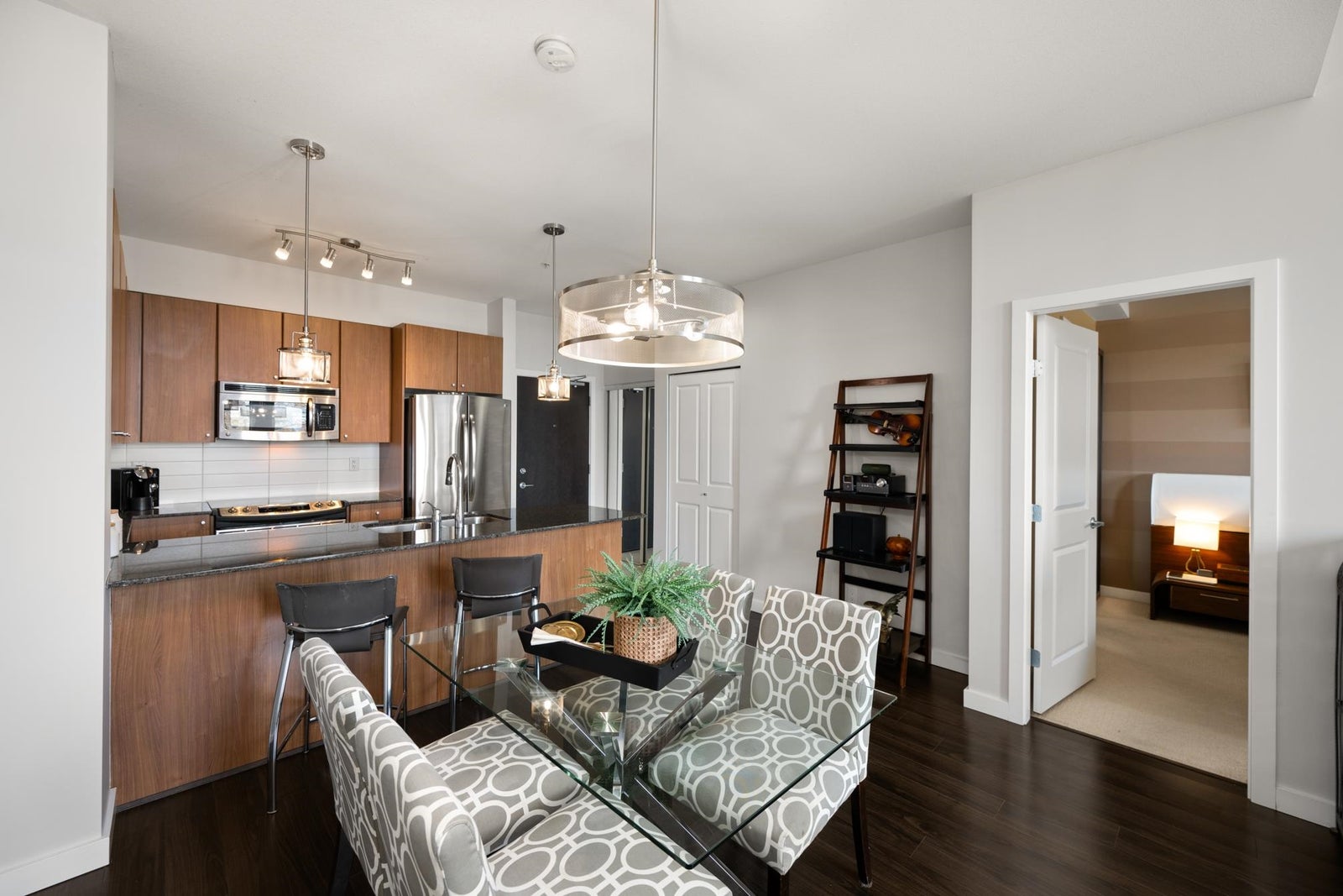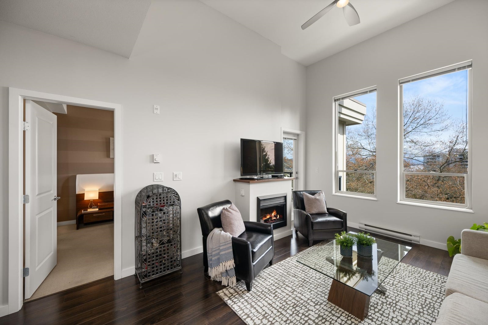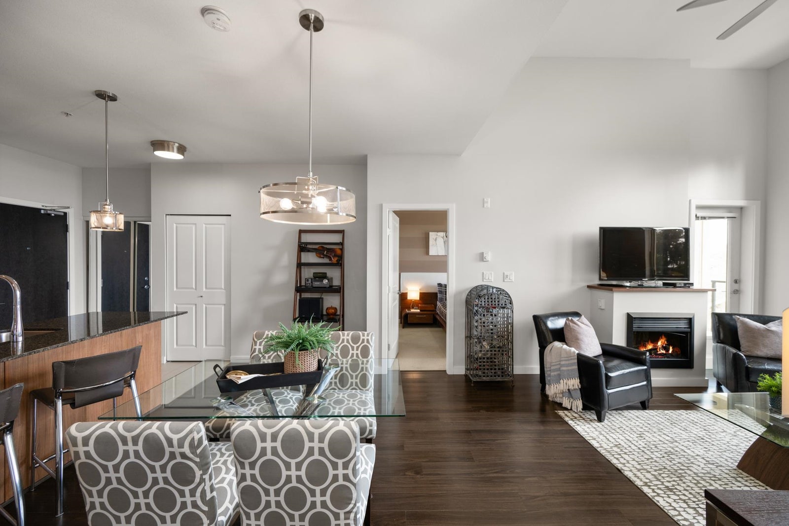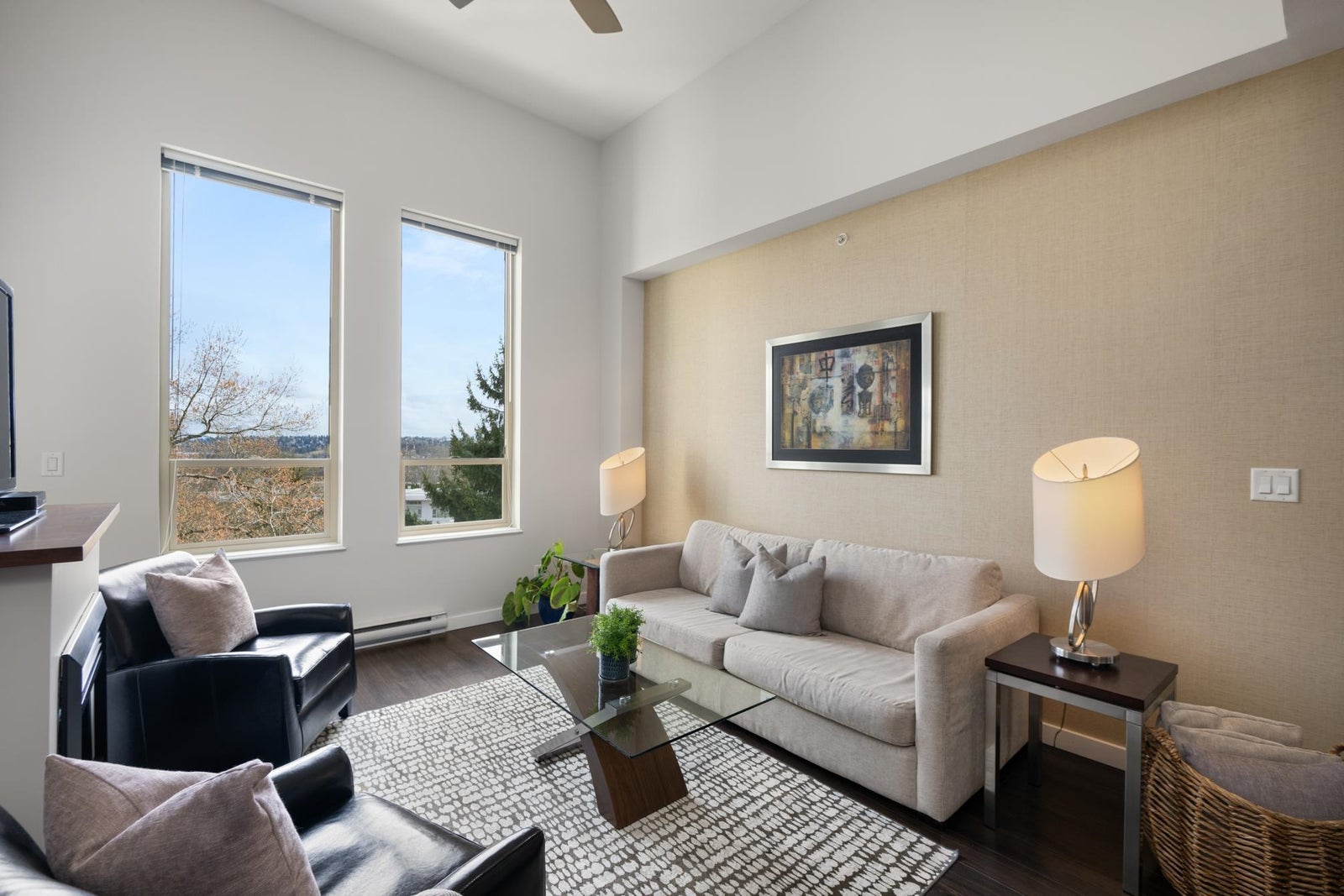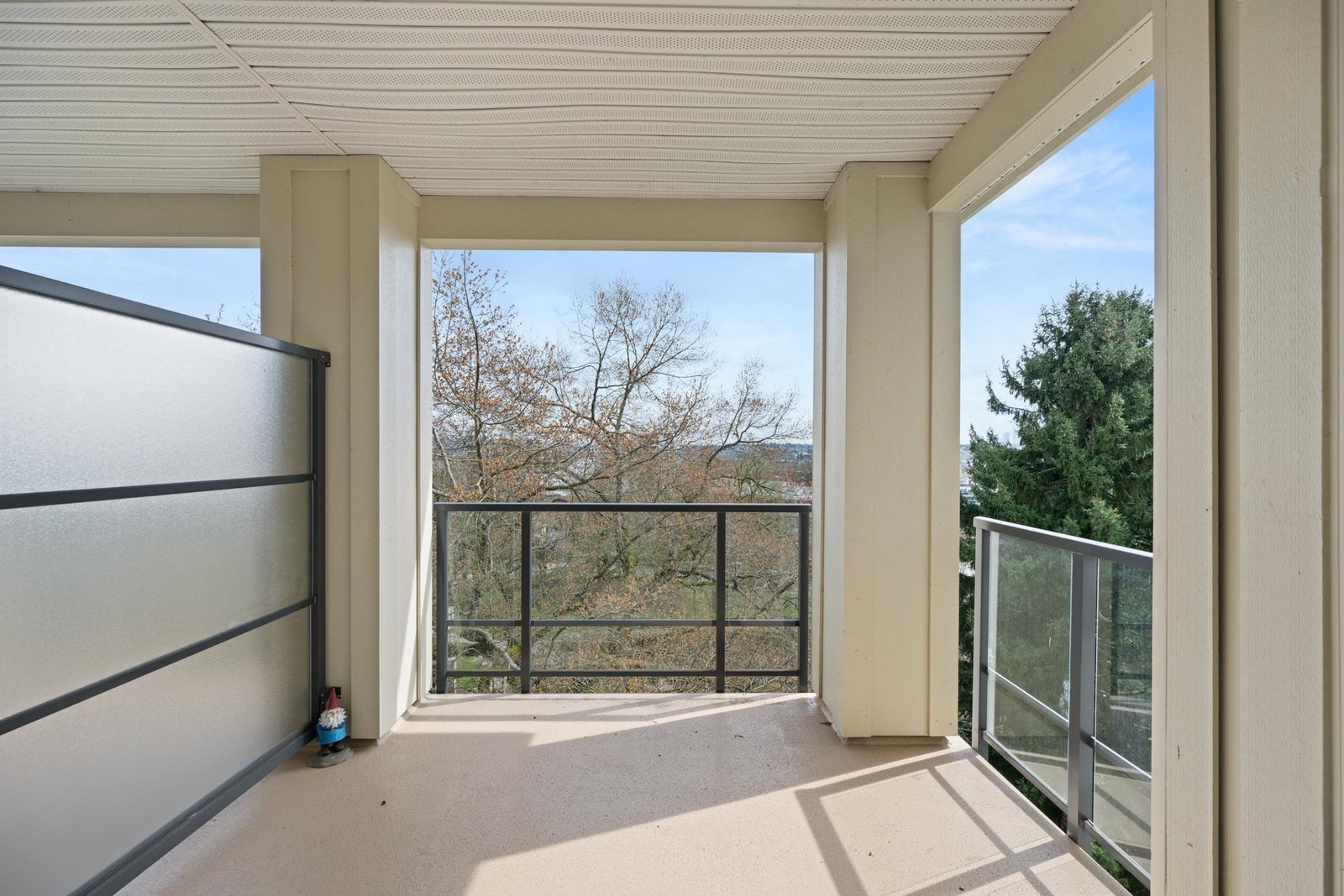 Welcome to this stunning TOP-FLOOR PENTHOUSE at The Grove in Victoria Hill! This bright & airy home boasts an open-concept layout, perfect for entertaining, w/ soaring vaulted ceilings & expansive windows that flood the space with natural light. The chef-inspired kitchen features wood cabinetry, a sit-up breakfast bar, granite counters, designer paint, sleek laminate flooring, this home is truly move-in ready. Thoughtfully designed layout places the bedrooms on opposite sides, creating a perfect sense of privacy. Lovely large covered deck—a peaceful retreat where you can relax w/ a coffee or unwind with a glass of wine while soaking in the Fraser River view & lush park-like surroundings! Amenities include a Gym, Basketball Court, Theatre, Library & Clubhouse. 1 PET OK!