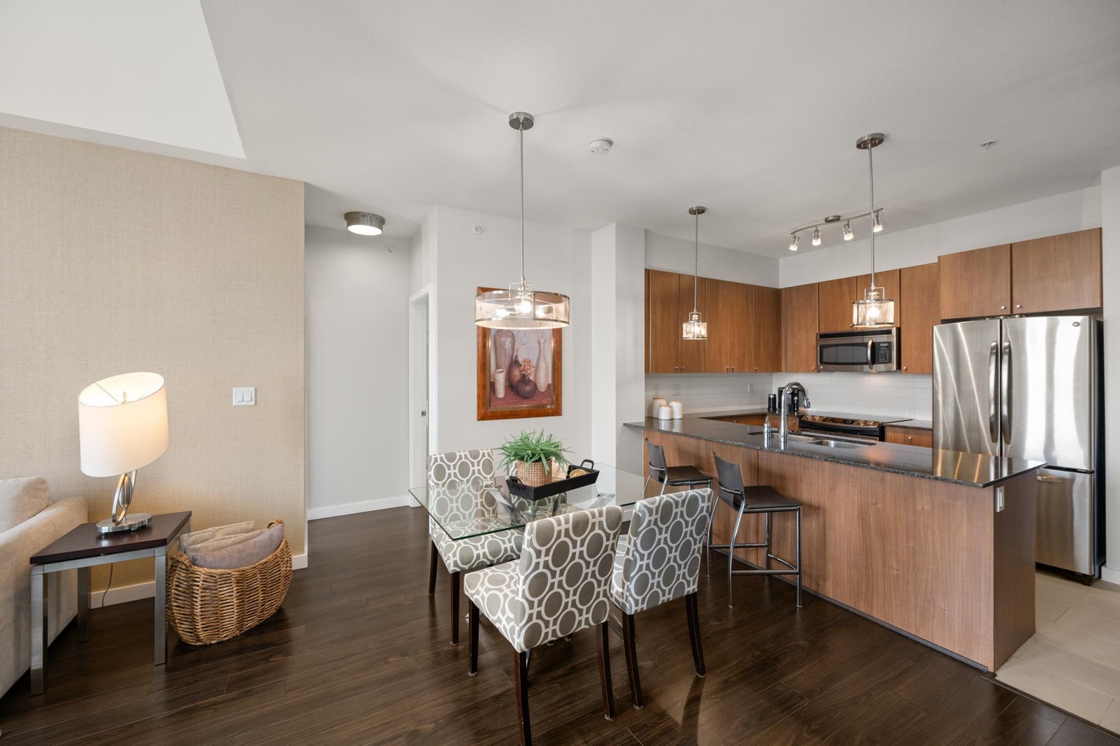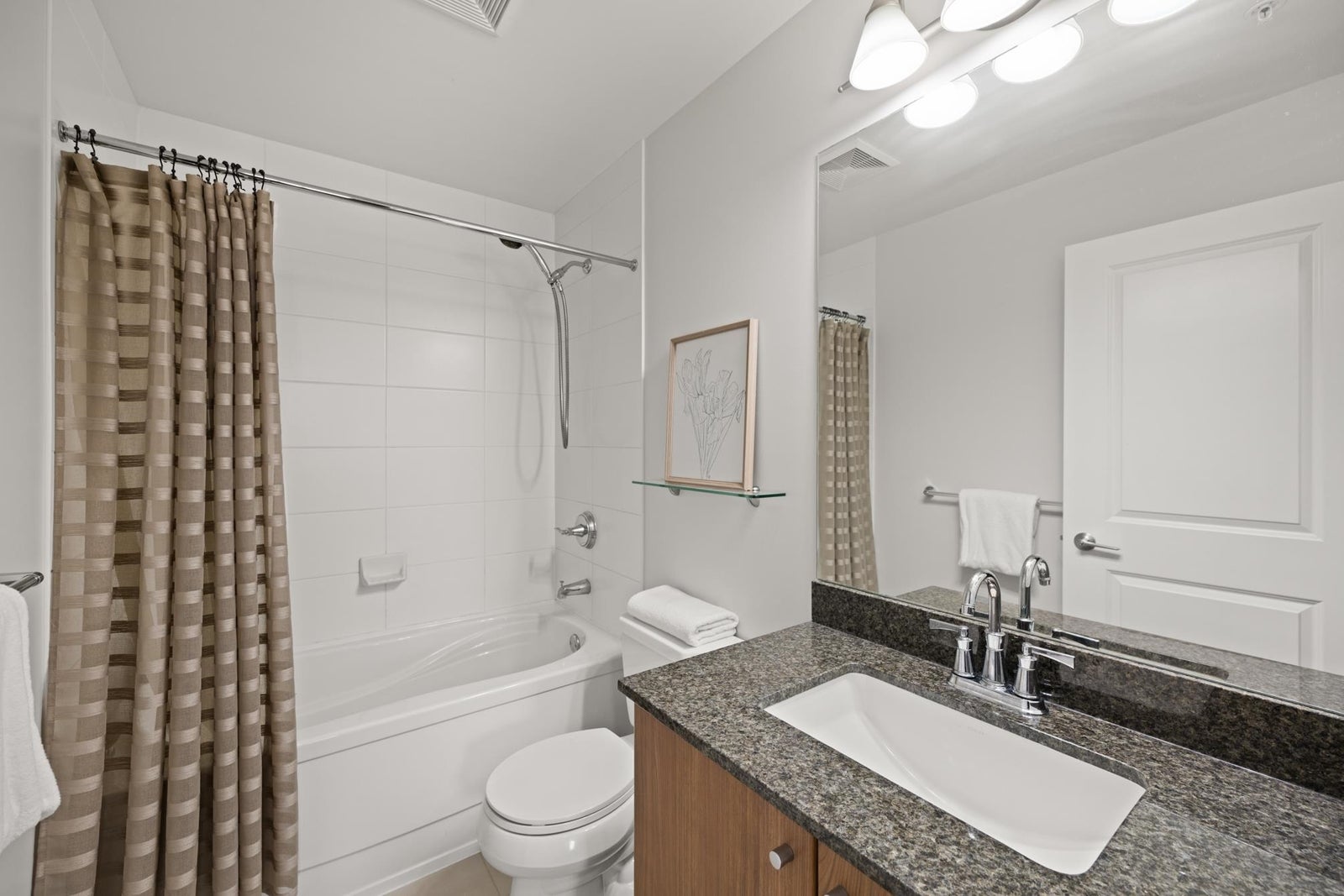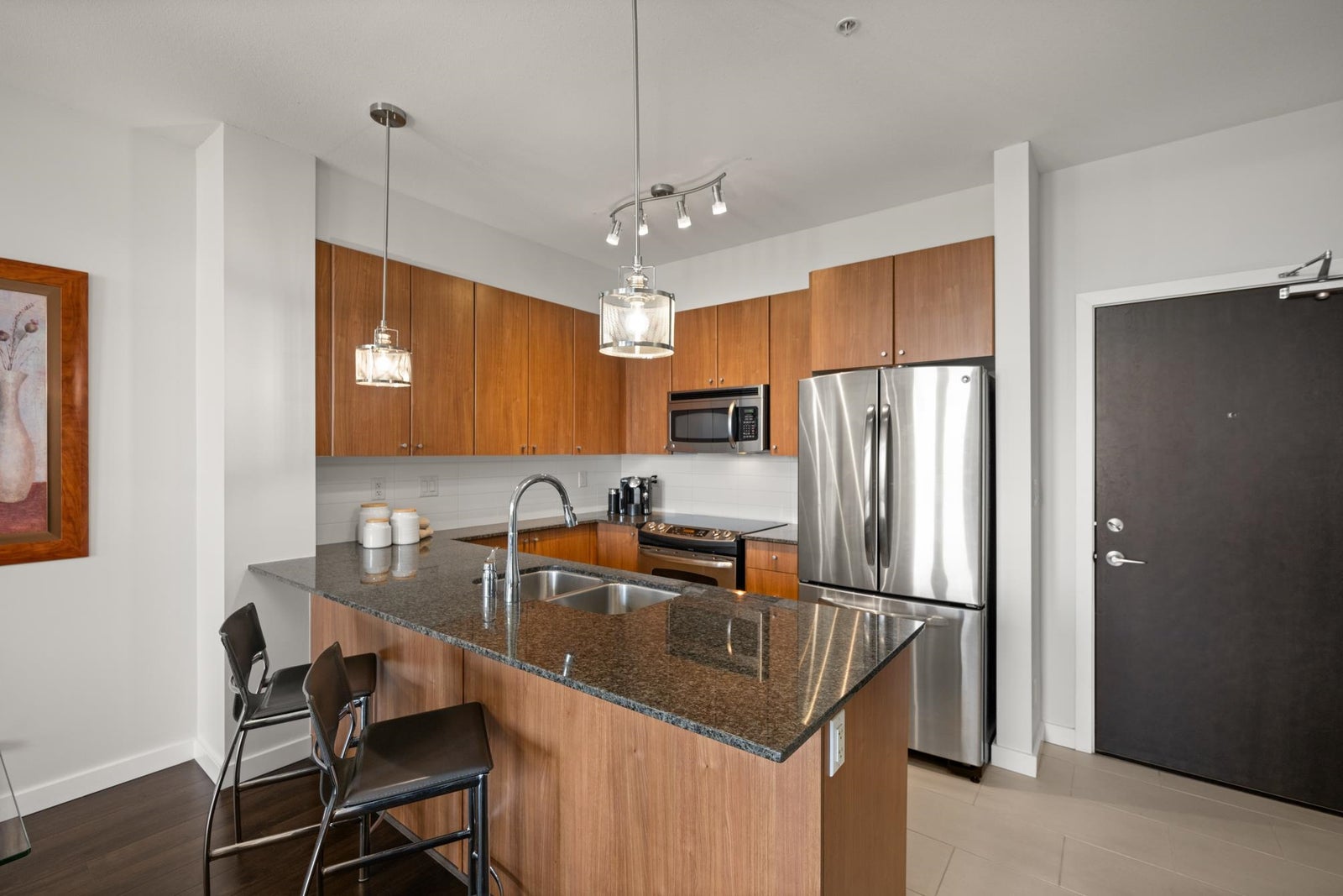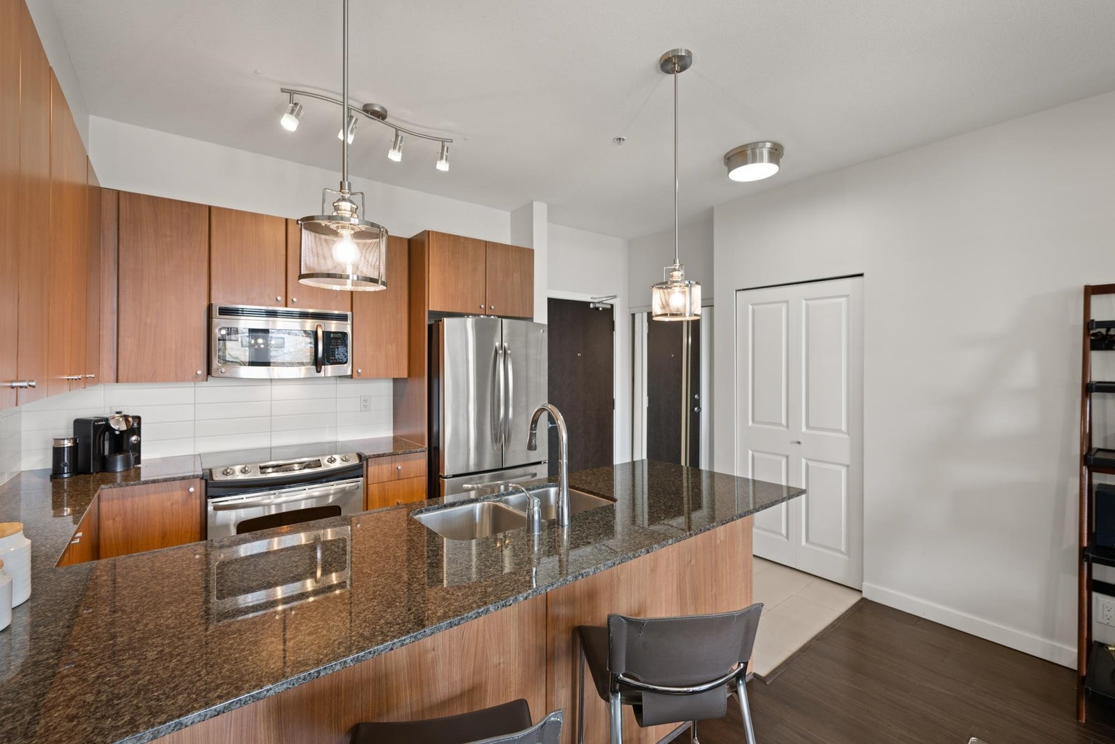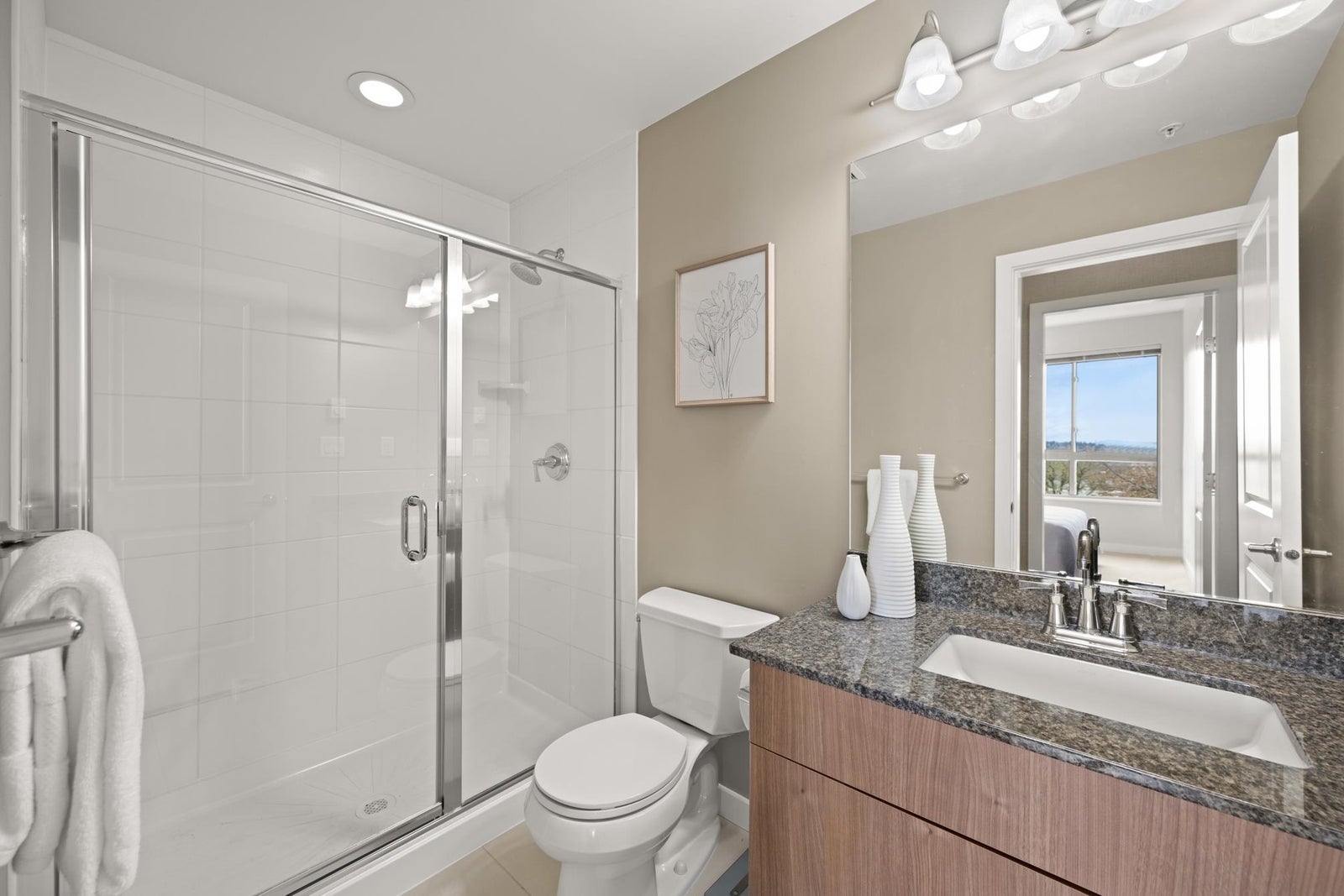 Welcome to this stunning TOP-FLOOR PENTHOUSE at The Grove in Victoria Hill! This bright & airy home boasts an open-concept layout, perfect for entertaining, w/ soaring vaulted ceilings & expansive windows that flood the space with natural light. The chef-inspired kitchen features wood cabinetry, a sit-up breakfast bar, granite counters, designer paint, sleek laminate flooring, this home is truly move-in ready. Thoughtfully designed layout places the bedrooms on opposite sides, creating a perfect sense of privacy. Lovely large covered deck—a peaceful retreat where you can relax w/ a coffee or unwind with a glass of wine while soaking in the Fraser River view & lush park-like surroundings! Amenities include a Gym, Basketball Court, Theatre, Library & Clubhouse. 1 PET OK!