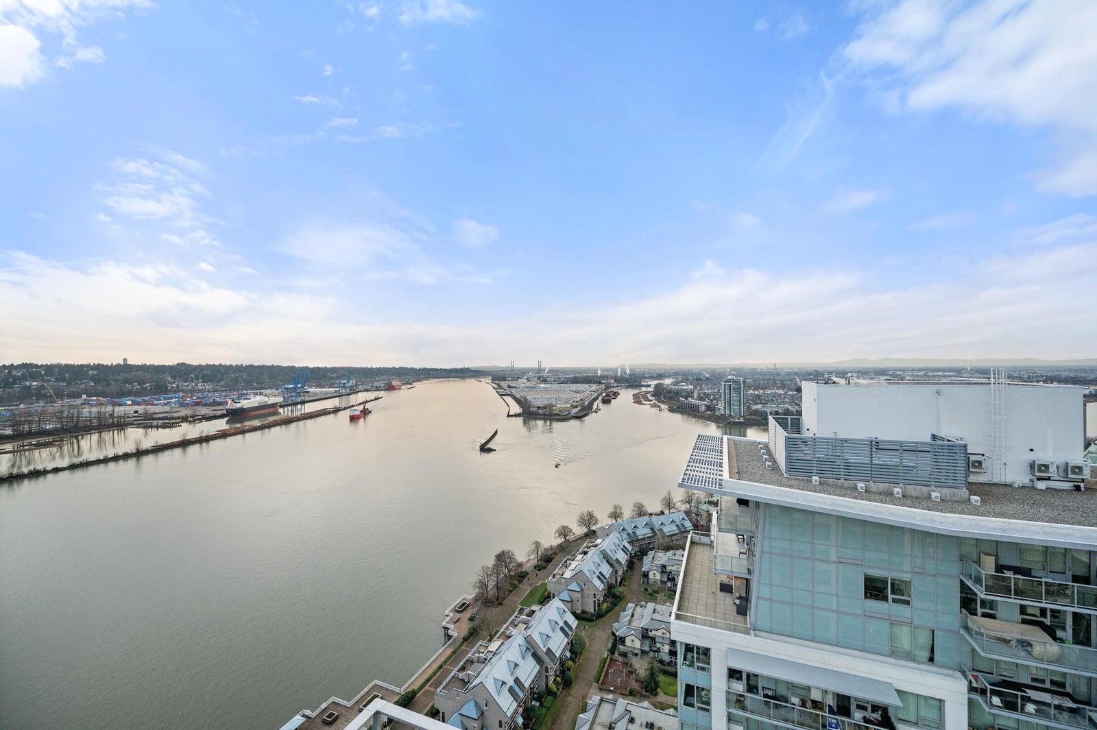 BONUS 2 PARKING STALLS-LARGE enough to fit 3 VEHICLES! WATERFRONT Living BREATHTAKING Fraser River & mountain view! Built by BOSA stunning 3 BDRM 2 BTHRM SUB-PENTHOUSE features an open-concept layout, incredible natural light, engineered HW floors, custom pantry & Cali-closet organizers & roller blinds! Kitchen boasts quartz counters, S/S appliances, a gas stove & A/C throughout! Spacious master suite that can easily fit a king-size bed, has a spa-like ensuite & walk-in closet. Covered 239 sqft balcony great for entertaining! BONUS laundry room w/ extra storage, EV charger & locker. Steps to Quay Market, Boardwalk, cafes, restaurants, SkyTrain & just 20 minutes to Downtown Van. Amenities F/T concierge, gym, bike room, clubhouse & parcel box 2 pets OK! Furniture Incl.