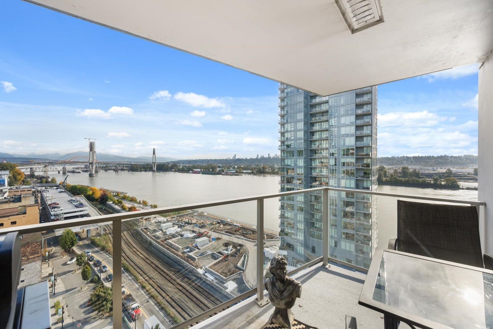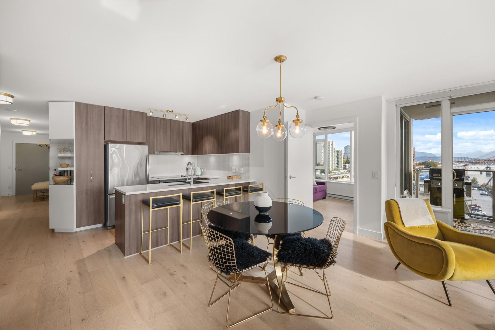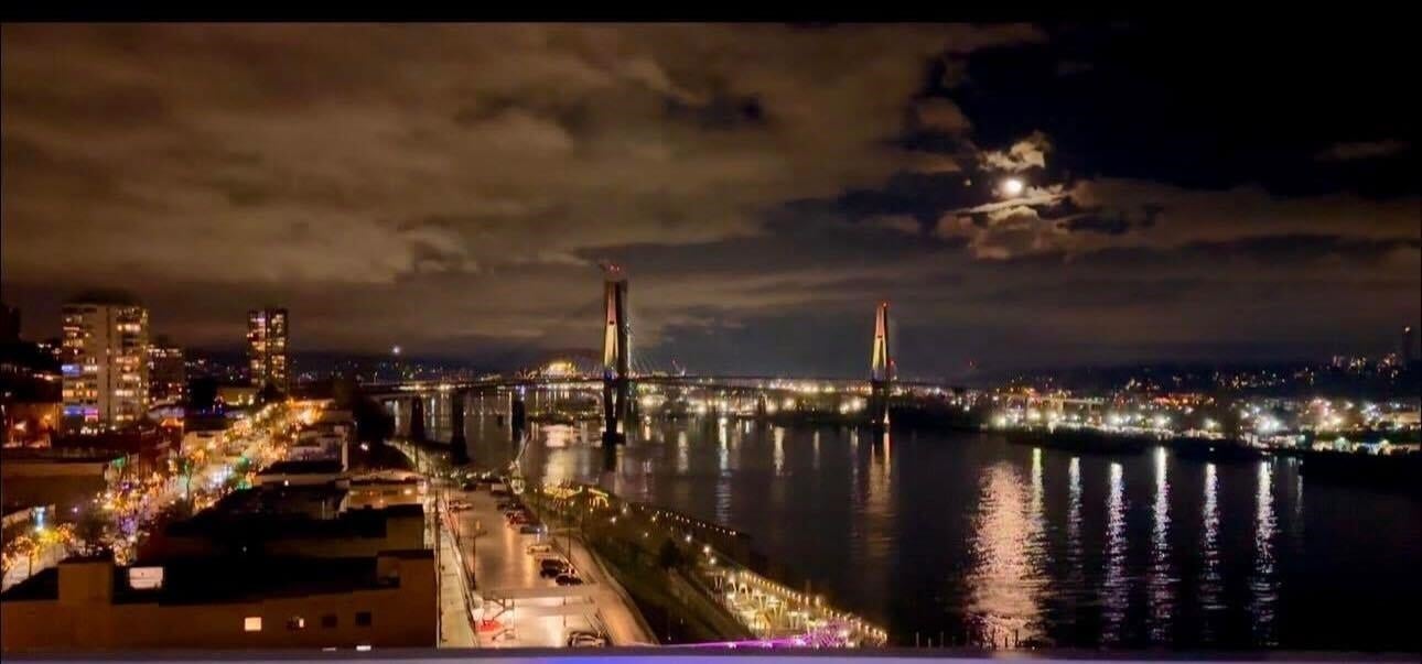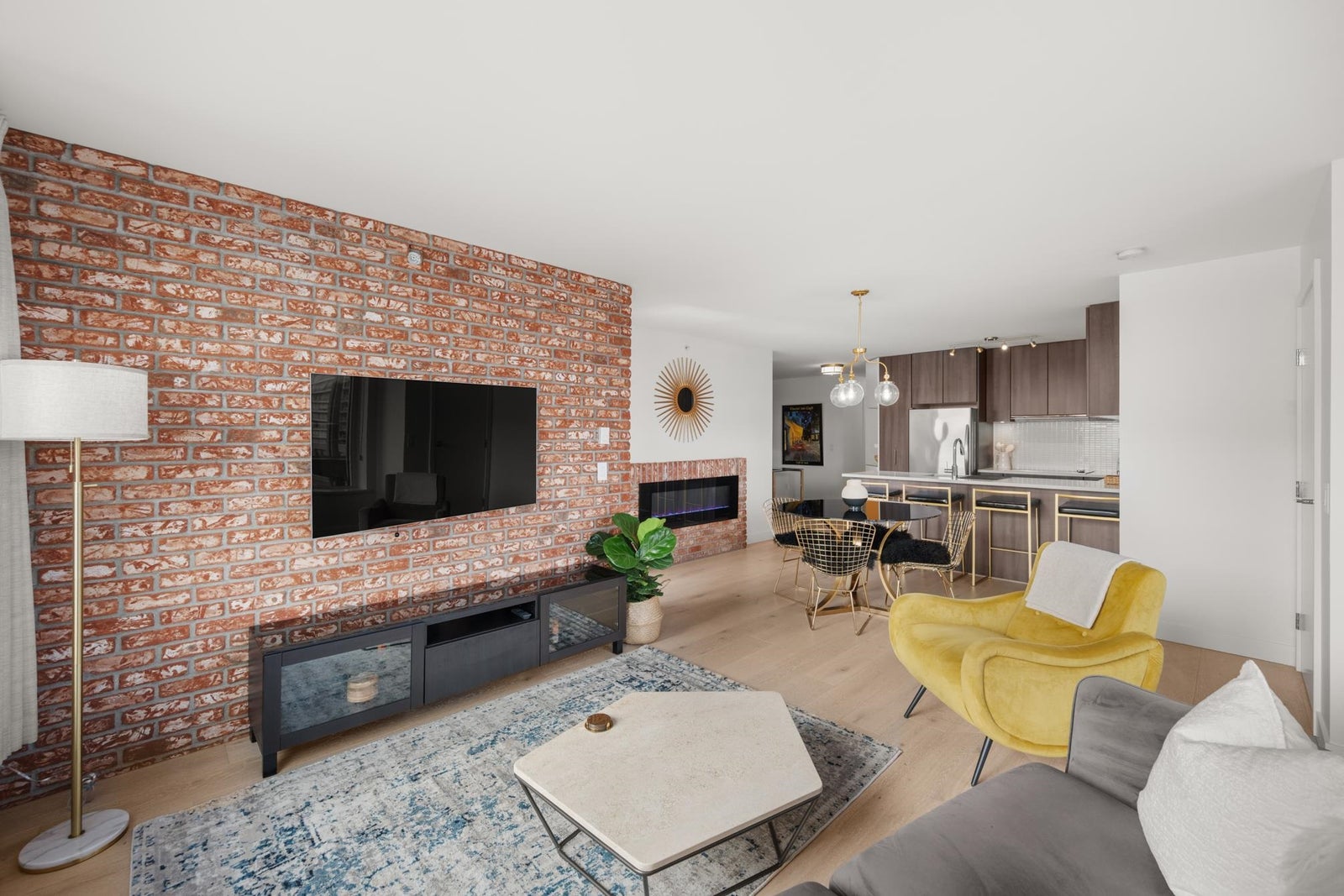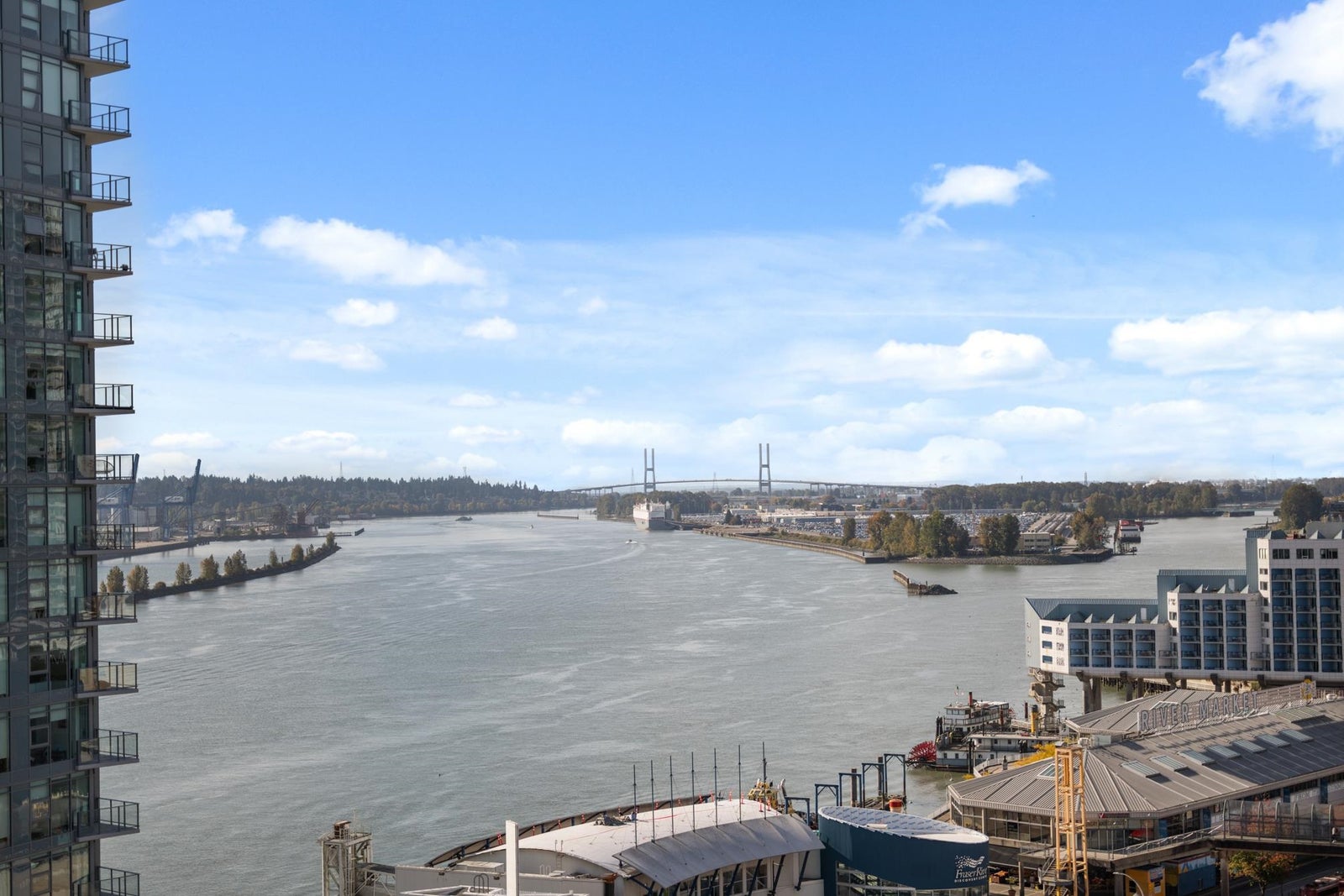View & Location! This STUNNING 2 BDRM 2 BTHRM + DEN corner unit at Trapp + Holbrook! A blend of modern comfort, custom upgrades & an unbeatable location! Enjoy sweeping views of the Fraser River & mountains from every room. Stylish living space filled w/ natural light, featuring exposed brick walls, designer paint, engineered HW flooring & new light fixtures throughout. The unit impresses w/ a custom pull-out pantry, sleek quartz counters, a stylish tile backsplash, premium S/S appliances, built-in storage, an inviting electric fireplace & custom window coverings. Steps to SkyTrain, shopping, restaurants, Pier Park & River market! Amenities include Gym, Clubhouse, rooftop deck w/ gas fire pit & BBQ. 1 Secure U/G Parking & 1 Locker!