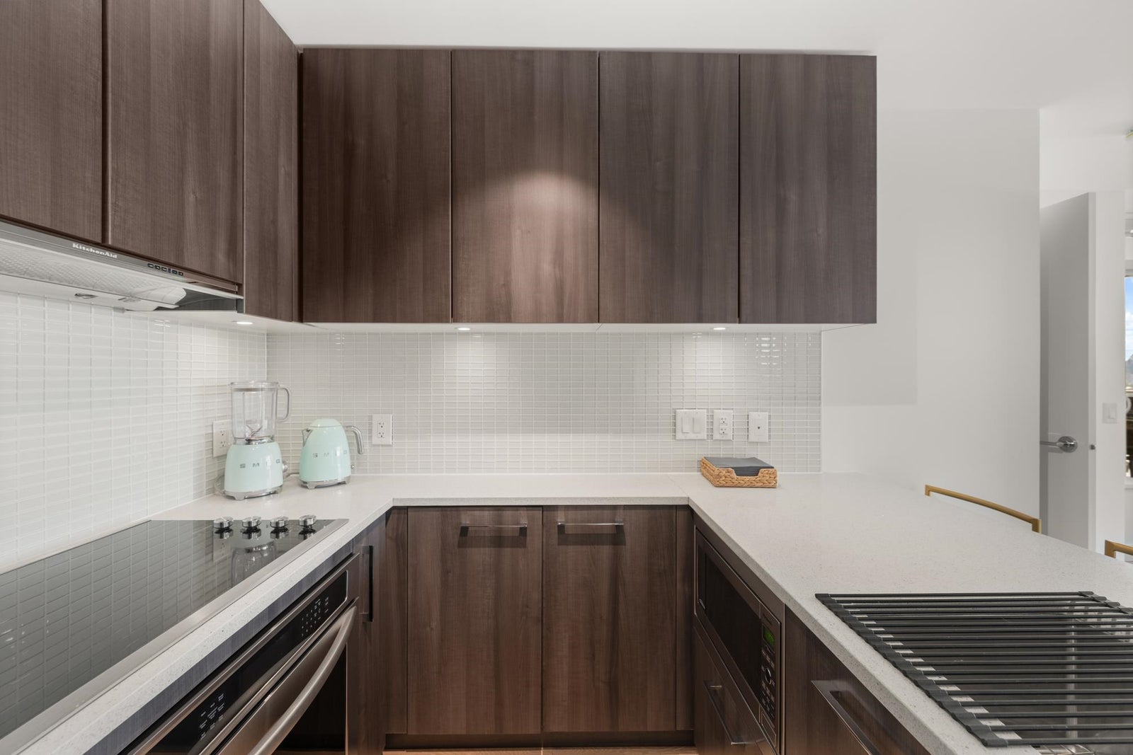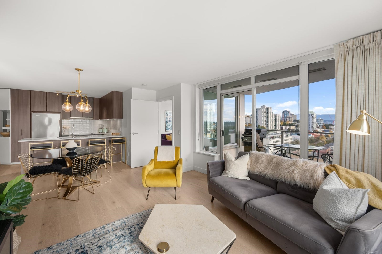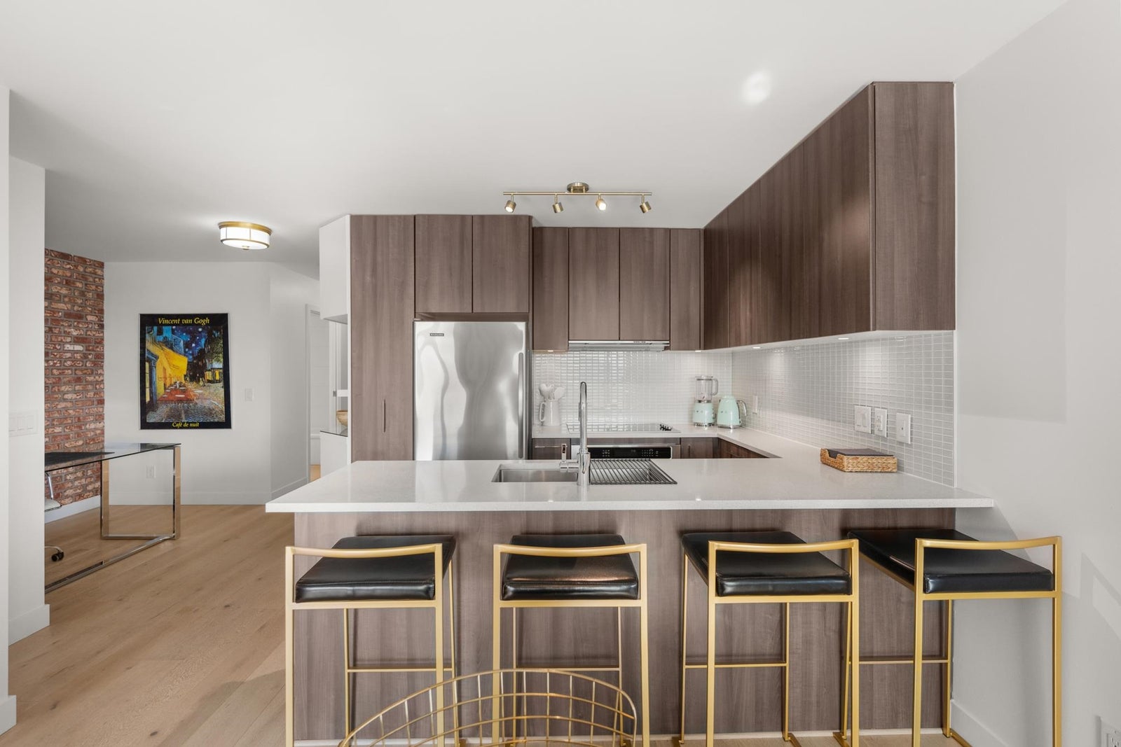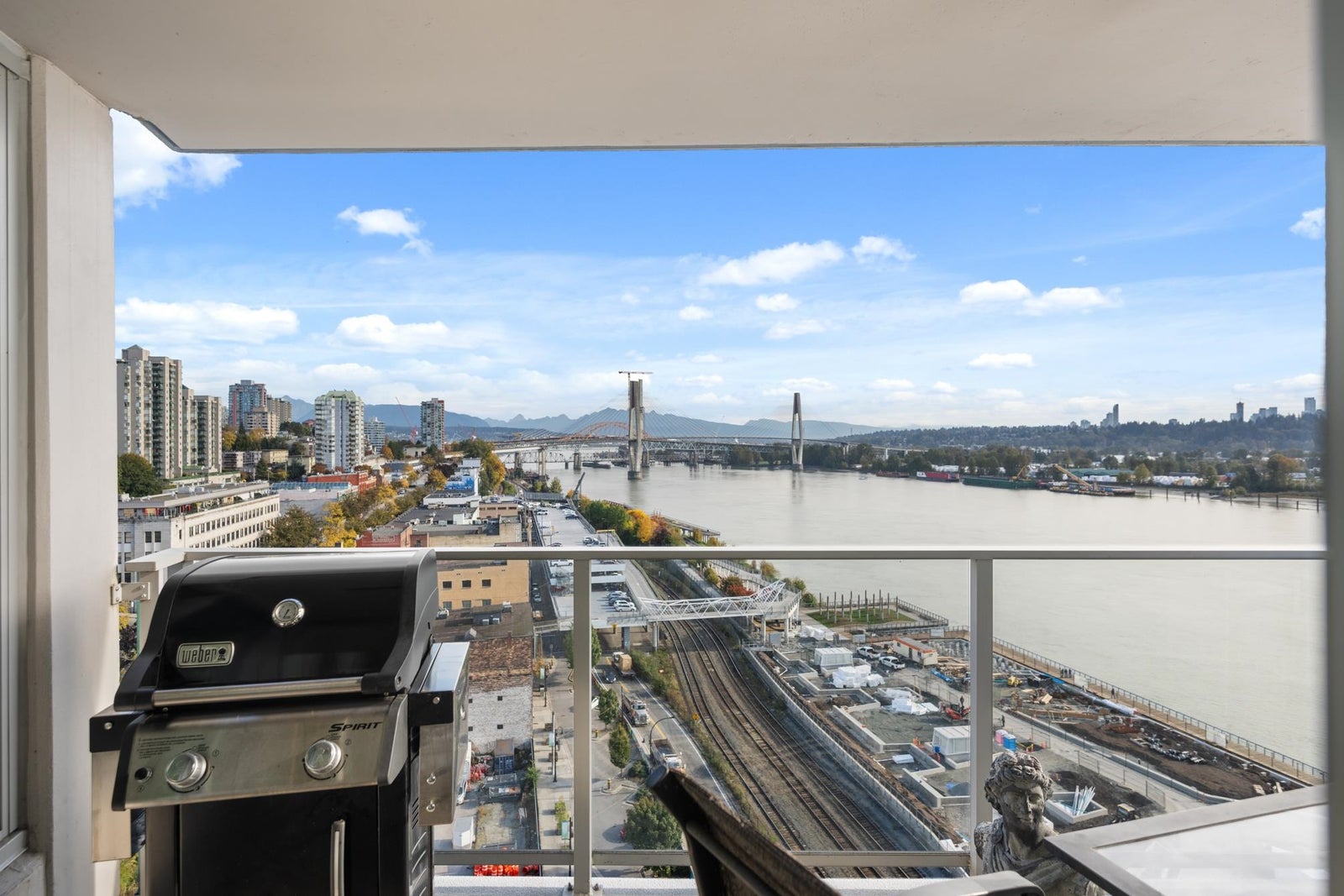 View & Location! This STUNNING 2 BDRM 2 BTHRM + DEN corner unit at Trapp + Holbrook! A blend of modern comfort, custom upgrades & an unbeatable location! Enjoy sweeping views of the Fraser River & mountains from every room. Stylish living space filled w/ natural light, featuring exposed brick walls, designer paint, engineered HW flooring & new light fixtures throughout. The unit impresses w/ a custom pull-out pantry, sleek quartz counters, a stylish tile backsplash, premium S/S appliances, built-in storage, an inviting electric fireplace & custom window coverings. Steps to SkyTrain, shopping, restaurants, Pier Park & River market! Amenities include Gym, Clubhouse, rooftop deck w/ gas fire pit & BBQ. 1 Secure U/G Parking & 1 Locker!