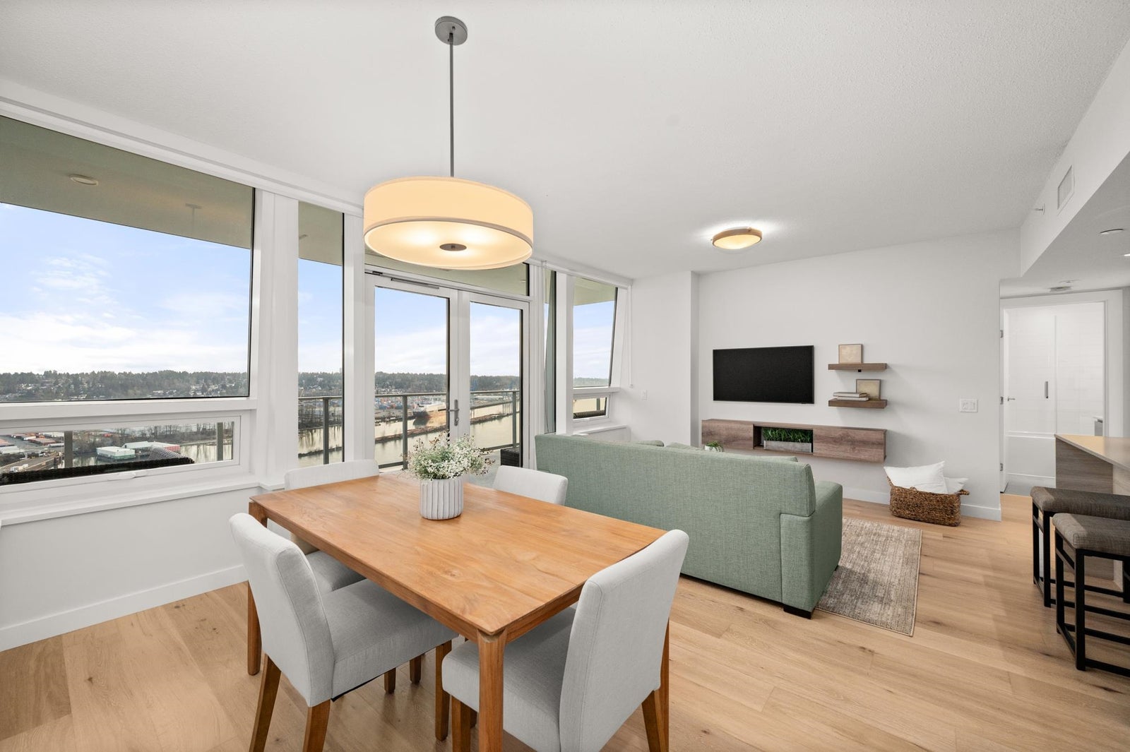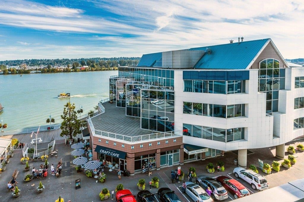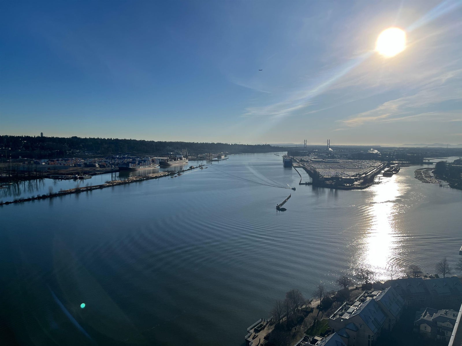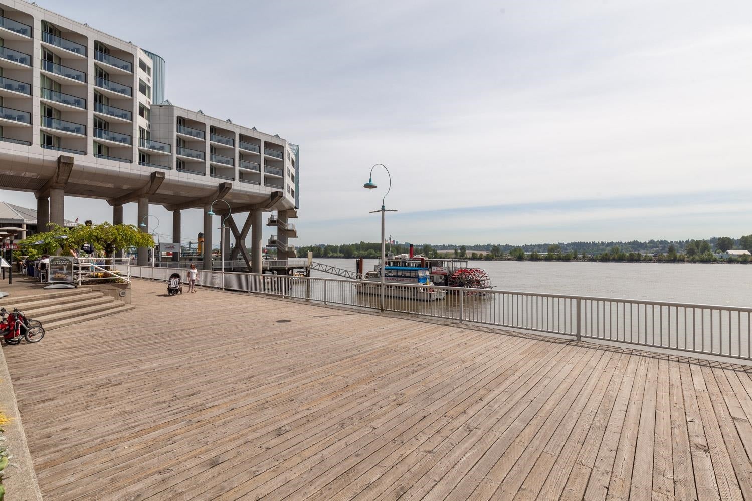 Open House Sat Oct 25th 230-4pm! BONUS 2 PARKING STALLS-LARGE enough to fit 3 VEHICLES! WATERFRONT Living BREATHTAKING Fraser River & mountain view! Built by BOSA stunning 3 BDRM 2 BTHRM SUB-PENTHOUSE features an open-concept layout, incredible natural light, engineered HW floors, custom pantry & Cali-closet organizers & roller blinds! Kitchen boasts quartz counters, S/S appliances, a gas stove & A/C throughout! Spacious master suite that can easily fit a king-size bed, has a spa-like ensuite & walk-in closet. Covered 239 sqft balcony great for entertaining! BONUS laundry room w/ extra storage, EV charger & locker. Steps to Quay Market, Boardwalk, cafes, restaurants, SkyTrain. Amenities F/T concierge, gym, bike room, clubhouse & parcel box 2 pets OK! Currently rents large stall for $300!