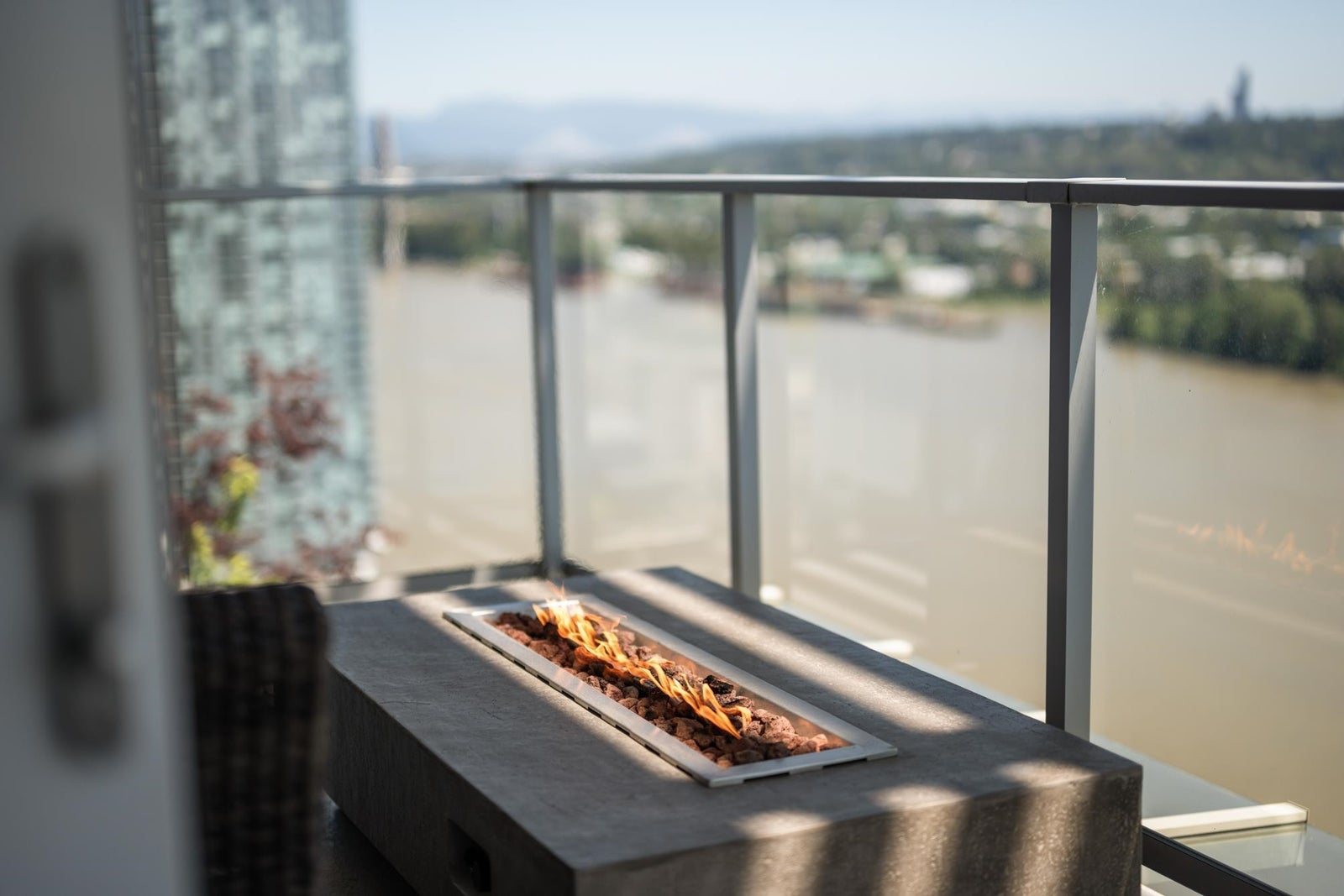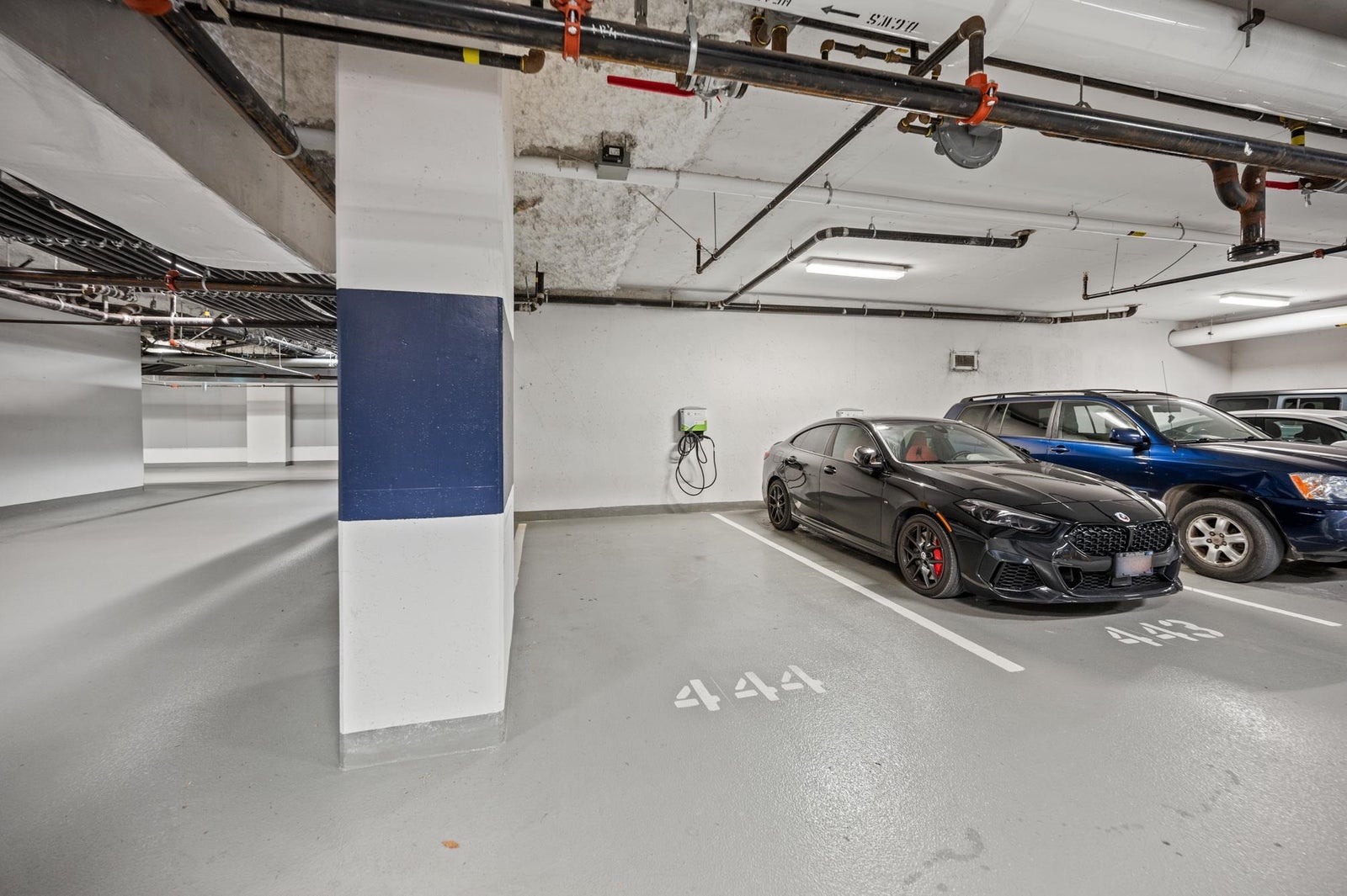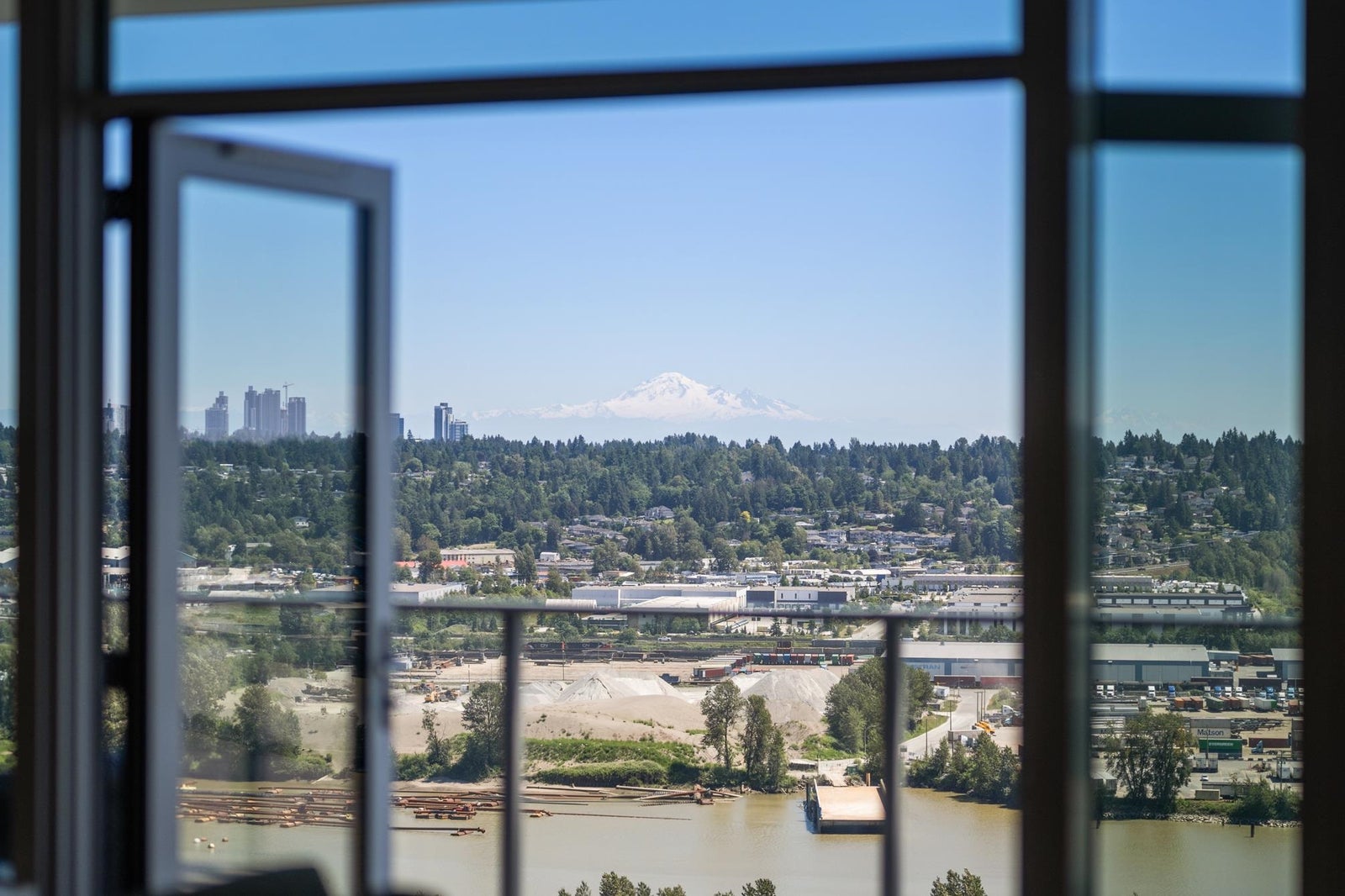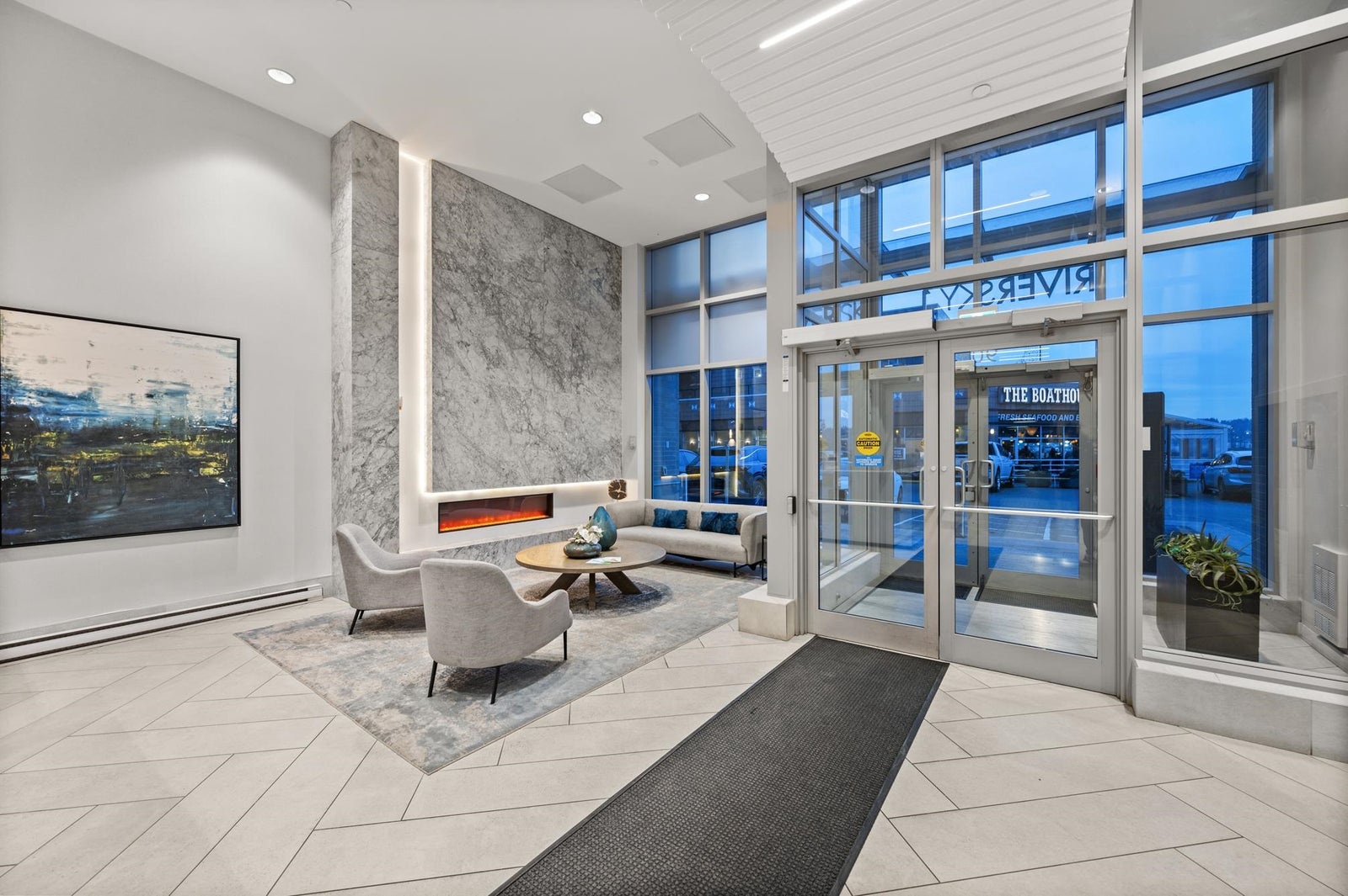 Open House Sat Oct 25th 230-4pm! BONUS 2 PARKING STALLS-LARGE enough to fit 3 VEHICLES! WATERFRONT Living BREATHTAKING Fraser River & mountain view! Built by BOSA stunning 3 BDRM 2 BTHRM SUB-PENTHOUSE features an open-concept layout, incredible natural light, engineered HW floors, custom pantry & Cali-closet organizers & roller blinds! Kitchen boasts quartz counters, S/S appliances, a gas stove & A/C throughout! Spacious master suite that can easily fit a king-size bed, has a spa-like ensuite & walk-in closet. Covered 239 sqft balcony great for entertaining! BONUS laundry room w/ extra storage, EV charger & locker. Steps to Quay Market, Boardwalk, cafes, restaurants, SkyTrain. Amenities F/T concierge, gym, bike room, clubhouse & parcel box 2 pets OK! Currently rents large stall for $300!