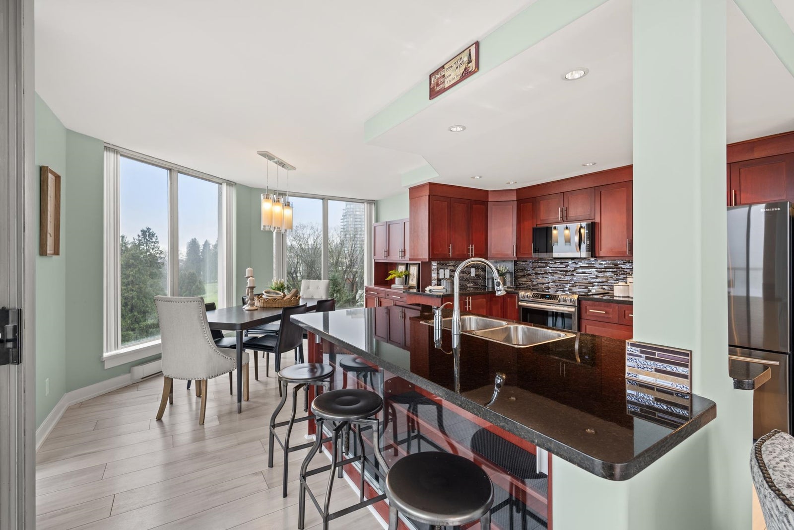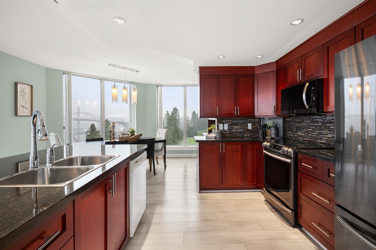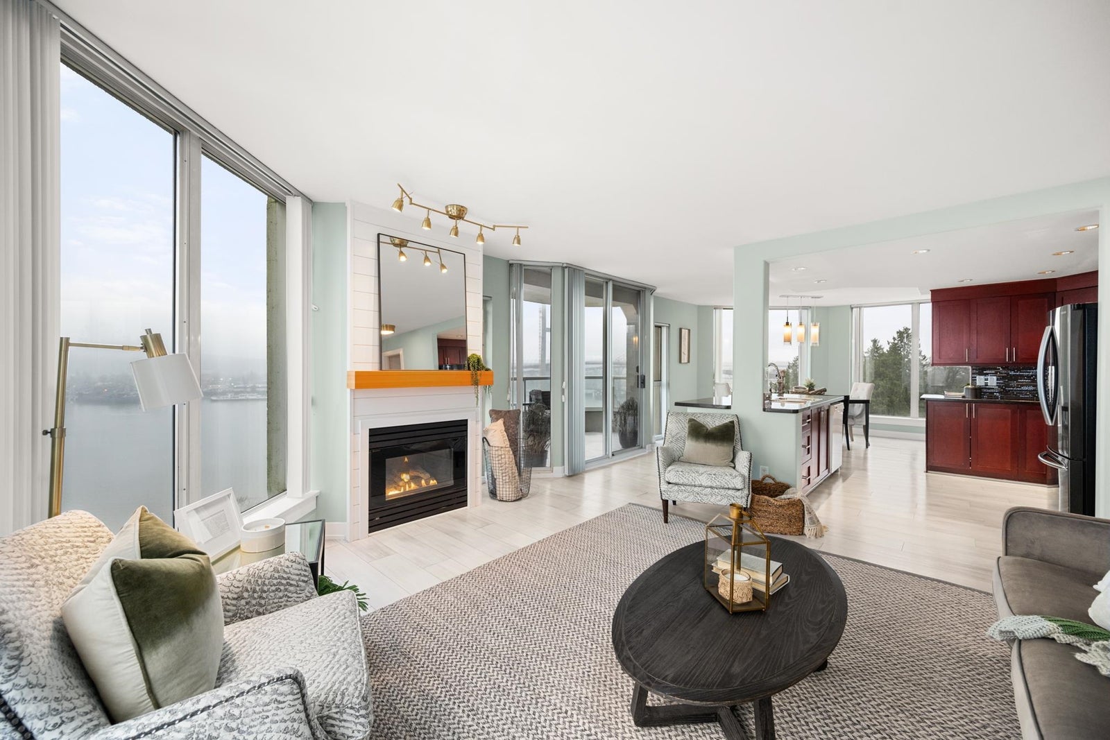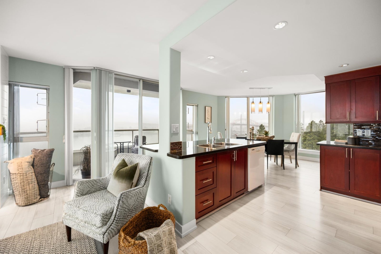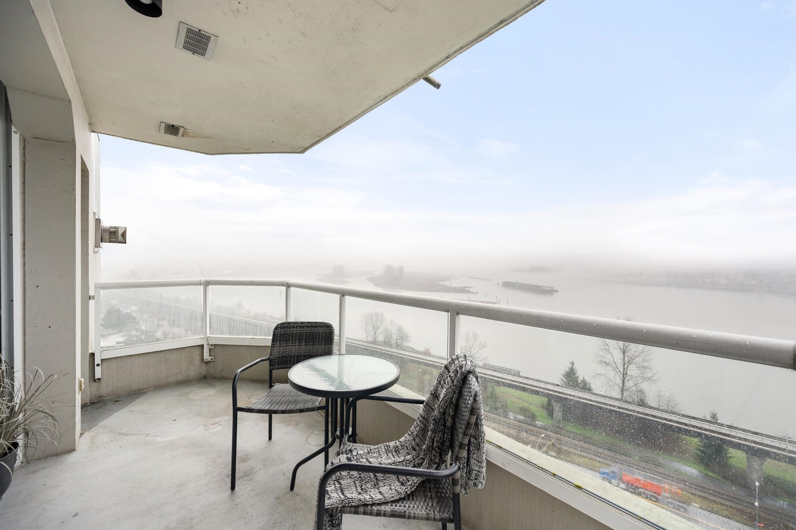 O/H SUN 230-4PM! Sweeping unobstructed Fraser River views, this beautifully updated condo offers bright open concept layout designed for comfort & style, covered front-facing balcony provides perfect space to relax & enjoy ever-changing river scenery, tasteful renovation featuring new laminate flooring, plush carpeting in BDRMS, elegant wainscoting, updated kitchen w/ granite counters, newer cabinets, S/S appliances, seamless flow into living & dining areas w/ cozy gas fireplace, well-designed floorplan offers two BDRMS positioned for privacy, functionality, tastefully updated BTHRMS. Resort-style amenities include indoor pool, hot tub, gym, games room, bike room. Steps to Queen’s Park, Glenbrook Ravine Park, Aquatic centre, schools, Columbia SkyTrain. 2 pets OK. 1 secure stall 1 locker